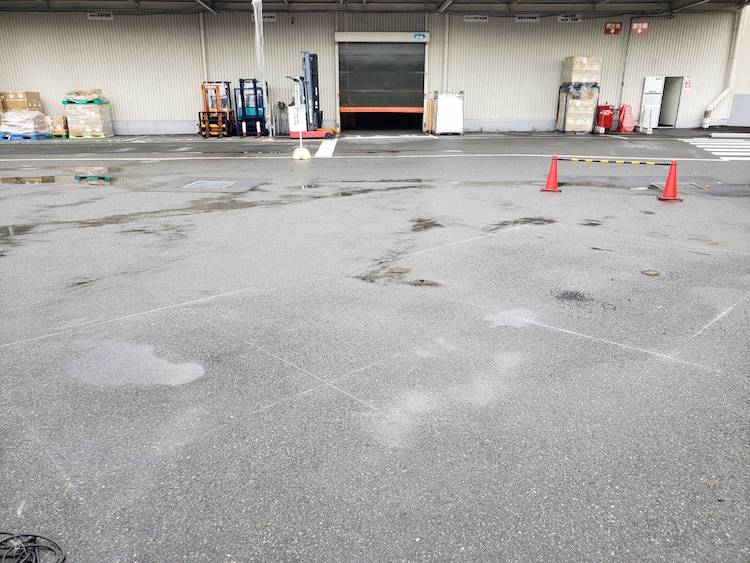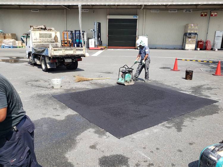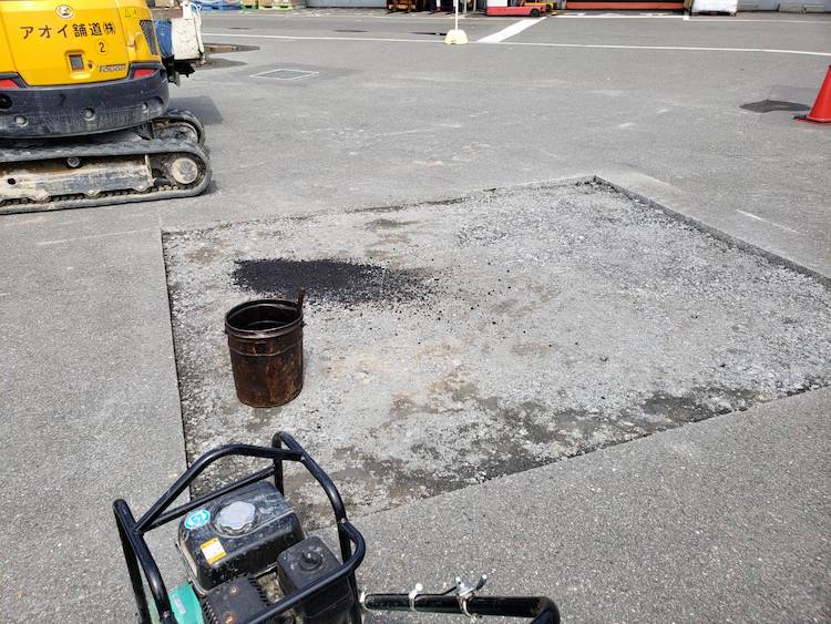 傷んでいるアスファルトの周りをカッターで切り込みをいれ、はつってから補修用アスファルトで埋め直しを行いました。